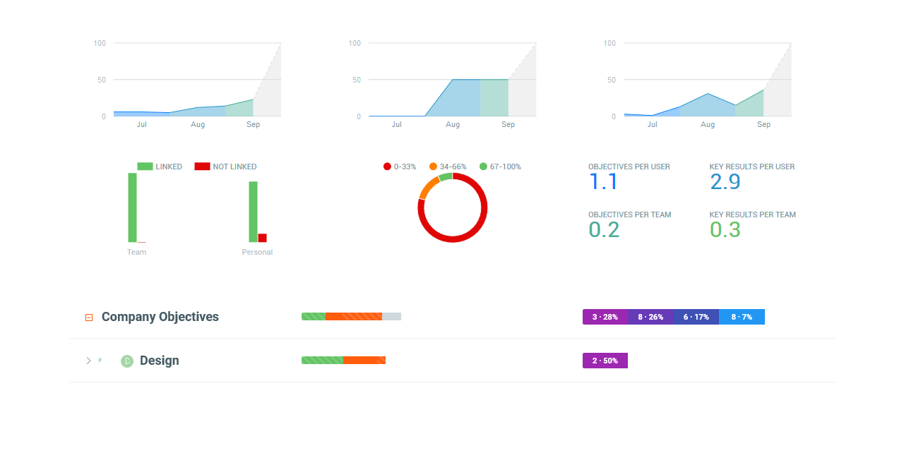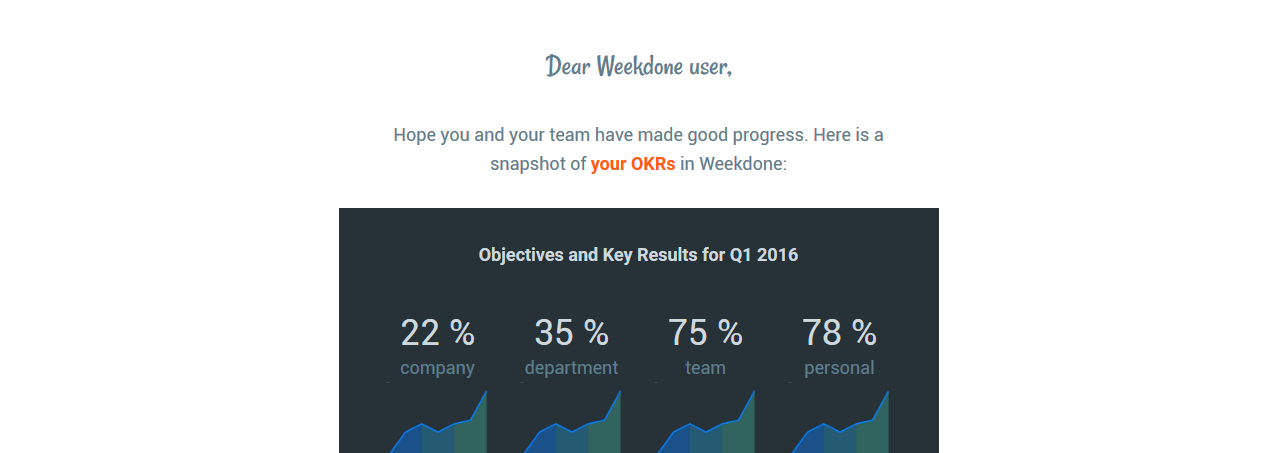 Get regular updates of OKR progress via beautiful e-mail reports. Configure the reports under Personal Settings - Notifications.